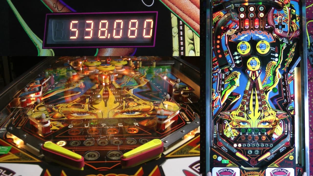 The "Barracora" pinball machine, produced by Williams Electronics in 1981, is a solid-state game designed by Barry Oursler, Roger Sharpe, and Steve Epstein. It features artwork by Doug Watson, which draws inspiration from H.R. Giger, known for his work on the film "Alien". The game has a sci-fi and fantasy theme, highlighted by its striking and somewhat controversial backglass art depicting a morphing predatory fish and a model's head.