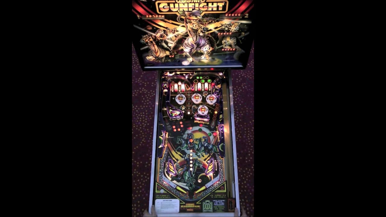 "Cosmic Gunfight" is a 1982 pinball machine by Williams, designed by Barry Oursler with artwork by Doug Watson and Larry Day. This game features a futuristic space-western theme and includes two flippers and a two-ball multiball mode.