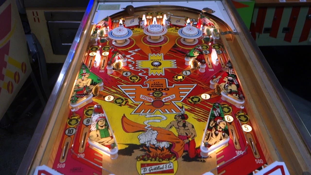 "Golden Arrow," released by D. Gottlieb & Co. in 1977, is a single-player electro-mechanical pinball machine designed by Ed Krynski with artwork by Gordon Morison. The game features a distinctive archery and target-shooting theme, with gameplay centered around hitting lit numbers and lanes to maximize scoring, particularly by aligning the lit arrow with the corresponding lit number for a bonus.