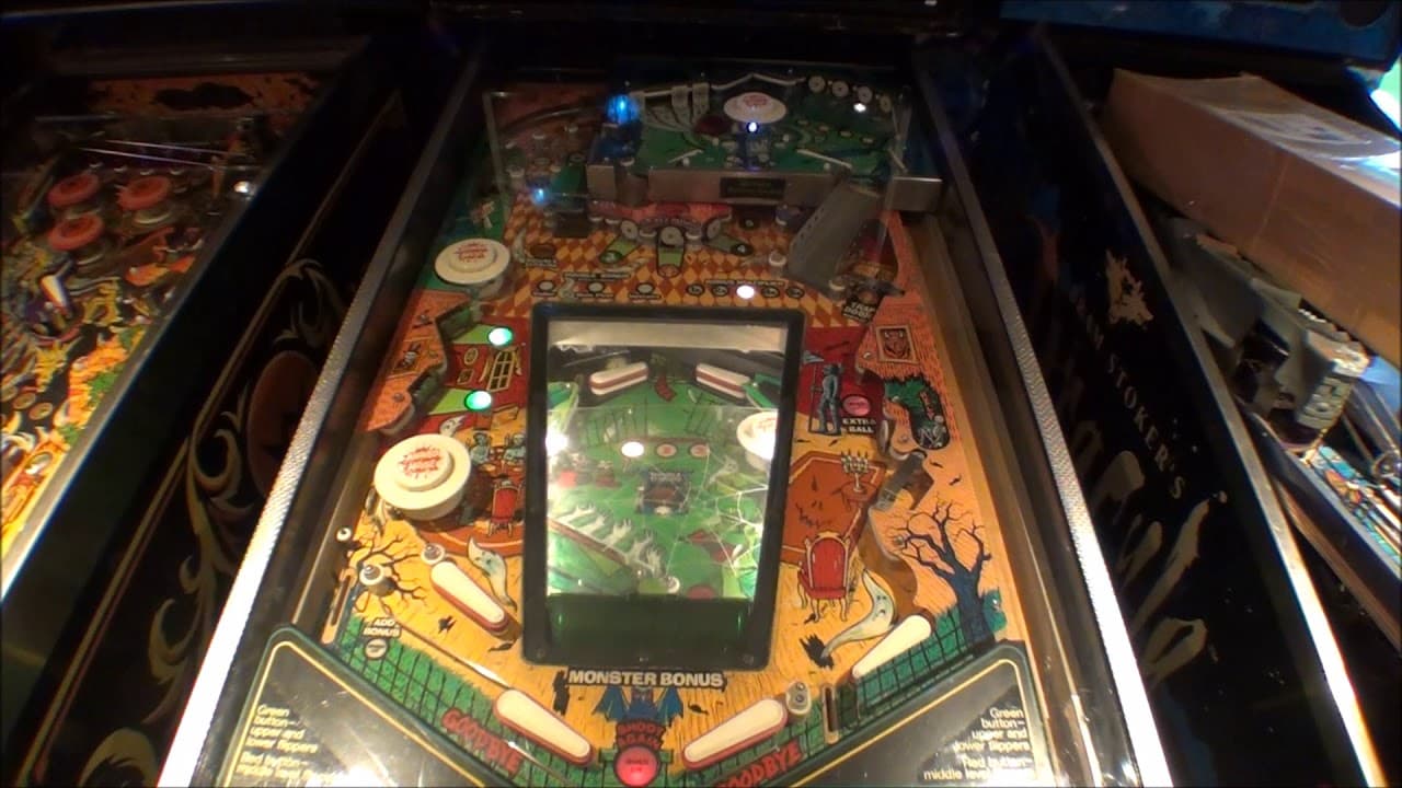 First things first, let’s discuss the three levels and going between them. When you plunge, balls will land in one of three holes at the top left. The left-most hole drops the ball to the lower playfield, where it is kicked out from “above” (towards you) the lower left flipper towards the bumper. The center hole / saucer kicks the ball out downwards on the main playfield. The right hole / saucer kicks the ball up and to the right onto the left side of the upper playfield towards the left flipper. Balls can go between the main and the upper playfield via the ramp on the right. Balls can go from the upper to the lower playfield via the hole on the left side of the upper; these land near the lower left flipper. Balls exiting the lower playfield are always popped to the main playfield through the scoop just below and right of the top left plunger holes; they usually are thrown towards the upper of the two flippers on the main playfield left. Balls can enter the lower playfield from the main one via the top left plunger hole, by going through the hole behind the center push-back target, and by shooting the “trap door” shot on the far right. From the center hole, the ball lands just above the lower left flipper. From the trap door, the ball is kicked out over the lower right flipper going left across the playfield. The flippers require getting used to. The upper and lower playfield flippers are not reversed, but it sometimes seems like it. The upper “right” flipper faces the way a left flipper normally does and vice versa. The lower playfield flippers aren’t reversed in terms of where they are visually either, right being right, but are reversed if you think in terms of which flipper it is if you were “facing” the lower playfield. To activate both the upper and lower flippers, you need to use the set of flipper buttons slightly further back on the cabinet than the regular buttons. When the ball changes playfields to or from the main playfield in either direction, you’ll have to quickly switch which set of buttons you use! On the main playfield, there’s a small drain area between the two flippers on the right; beware! Completing a set of drop targets in either the lower or upper playfield activates double scoring on the opposite playfield. Completing them a second time activates double scoring on the main playfield. (How’s that for convoluted?) If you do enough work in the top or bottom, the other two playfields will both be worth double. Completing the lower playfield drops seems to be the easier of the two. Each visit to the upper or lower playfield raises your “monster bonus” multiplier, up to 5X. Monster bonus is earned on just these two playfields by hitting the drop targets and the lower standup targets. If you plunge to the upper playfield and the ball exits it out the left to the lower playfield rather than out the right via the ramp to the main, your bonus multiplier will already be at 3X. Points are primarily earned by hitting the targets on all three playfield – drops upper and lower, standups on the main. Strategy is to keep going upstairs and downstairs as much as you can and smacking the heck out of the targets while there. Lastly, the game tends to play slow unless the operator has consciously steepened it and is notorious for having maintenance issues. Fun, but a risk to use in competition due to its reliability.