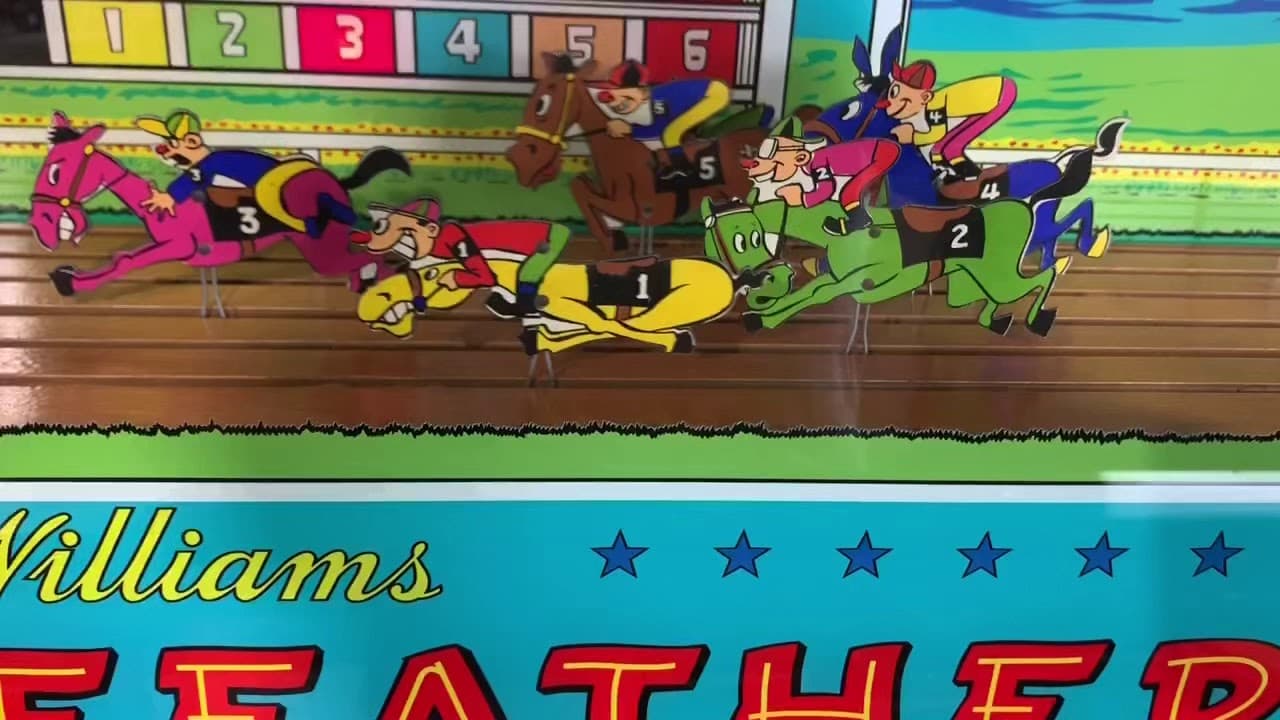 The "Horsefeathers" pinball machine, released by Williams Manufacturing Company in January 1952, is a two-player, electro-mechanical game designed by Harry Williams, with artwork by George Molentin. This unique machine features a head-to-head configuration, allowing two players to compete simultaneously on separate playfields.