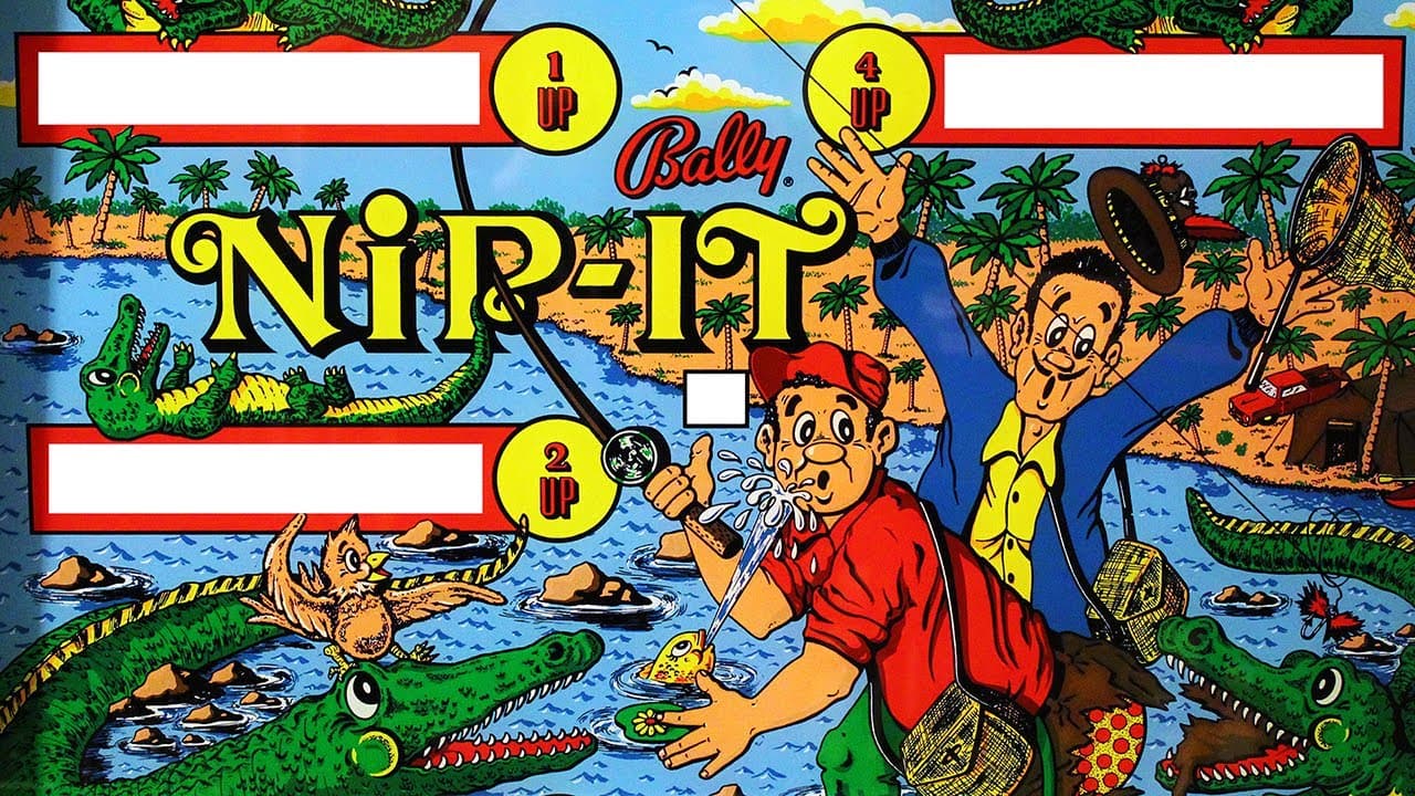 How about 3 flipper buttons? But the upper button on the right triggers a “gator grabber” metal loop instead of a flipper. You’ll see. The Skill Shot is to roll over one of the top white discs that lights either the red bumpers or the yellow bumpers, then have the ball fall into the 500 point saucer. When the ball is ejected from the saucer, it goes down and to the right; you want to hit the “grabber” button to have the gator metal bar come out of the upper right side to catch the ball as it does so. This scores 1000 points plus a bonus advance for going down the gator lane and feeds the ball towards the right flipper when it comes out of the one-way gate below. The grabber can also be used as a flipper of sorts: if you trigger it early, before the ball would be trapped inside it, it will push the ball away to the left. If you can tell that the ball won’t be rolling quite far enough to the right to get inside the grabber, you might want to do this to change its trajectory. Like all games with zipper flippers, you want to keep them closed as much as possible. And like many other zipper games, it’s the center mushroom bumper that closes flippers. On Nip-It, the white rollover disk to the right of the mushroom bumper opens the flippers. There’s an “Open Gate” standup target on left side middle, which lights on some funky switch hits cycle (it does not appear to be keyed to any of the scoring reels). If you see it lit, go ahead and shoot it to open the lower right gate, otherwise ignore that target. A ball can be locked in lower right-side saucer, which will score your bonus and feed a second ball to plunger lane. When you get the new ball to the plunger, go for whichever light-bumpers button you haven’t already triggered plus the 500 point top saucer again. Grab the ball as it exits, and when it feeds out the bottom of the gator gate, close the flippers if you haven’t already done so, then let the ball settle onto them. Now you have a strategy choice to make. One option is to shoot for either “release ball” target in the upper center of the game to start multiball. Your bonus, maximum 10000, does NOT reset when you lock a ball, so if your bonus is close to 10K, this is a good choice. If you go this route, try to relock a ball to collect your bonus again, then re-release it, etc. to collect your bonus multiple times. The other choice is to shoot the left gate or up top for gator-grab-all-day. This can be done even if you’re in multiball if you have a ball cradled on the left flipper and can just keep going into the gate or up top from the right flipper, then catching the ball on it again when it feeds out of the gator. The risk here is that on some Nip-Its, the feed from the gator may drain down the center some of the time. Like Gator and other zipper flipper machines, backhand flips may be more accurate or stronger than forehands. As always with zipper flipper games, top priority is to keep the flippers zipped as much as possible and let the ball settle onto the zipped flippers whenever you can to set up controlled shots via microflips. When you have the flippers zipped and start multiball, try to keep one ball settled on the zipped flippers and just knock the other ball around. Final note: locked balls can be stolen by subsequent players – beware!