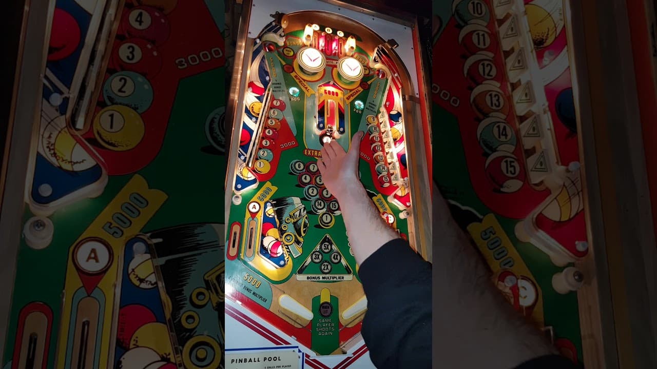 "Pinball Pool," a pinball machine by Gottlieb released in June 1979, combines a classic billiards theme with engaging pinball mechanics. Designed by Ed Krynski with artwork by Gordon Morison, the game features two flippers, drop targets, and straightforward gameplay focused on scoring by hitting pool balls.