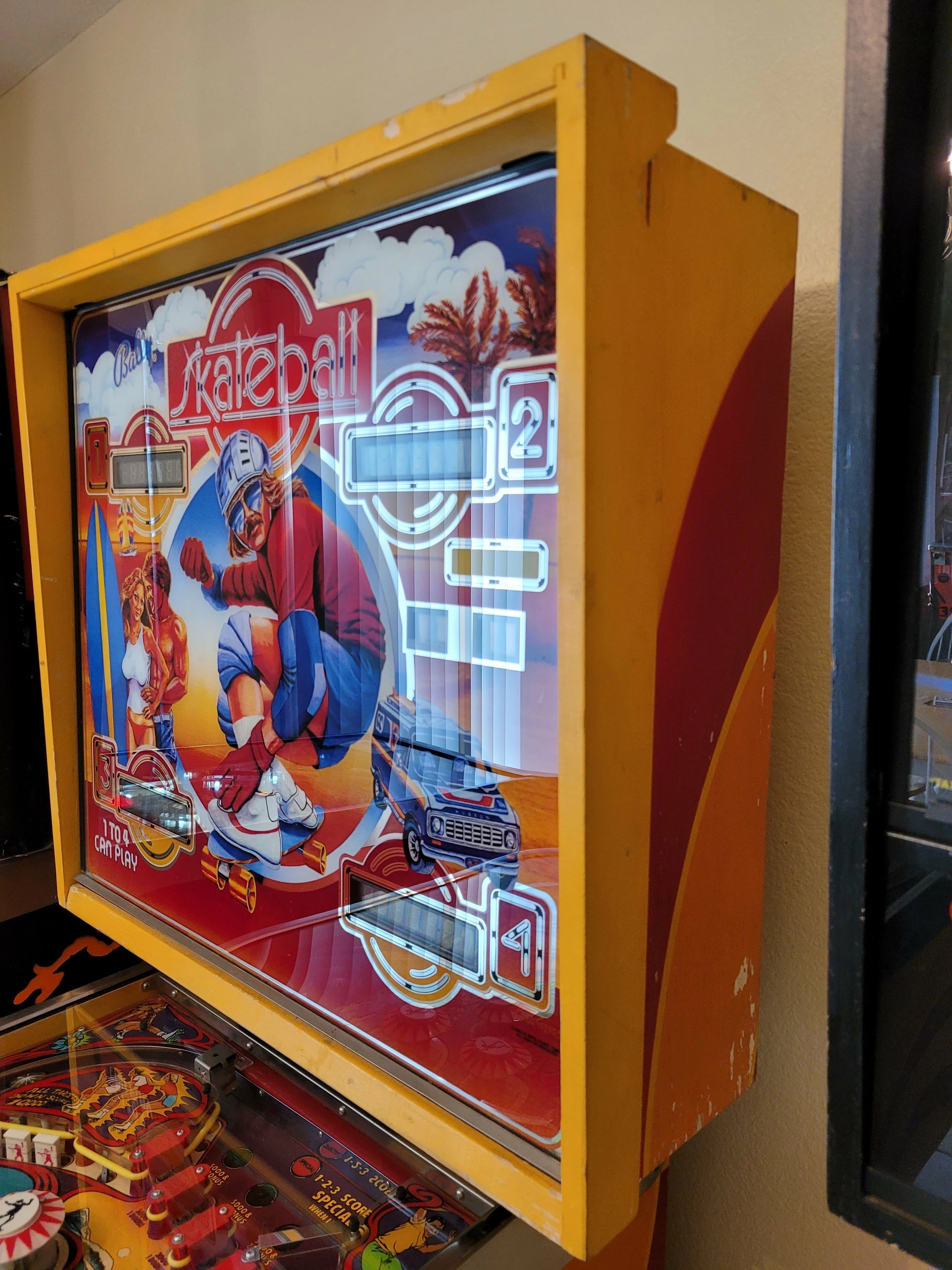 The "Skateball" pinball machine, produced by Bally in 1980, features a unique skateboarding theme designed by Claude Fernandez with artwork by Greg Freres, Kevin O'Connor, and Margaret Hudson.