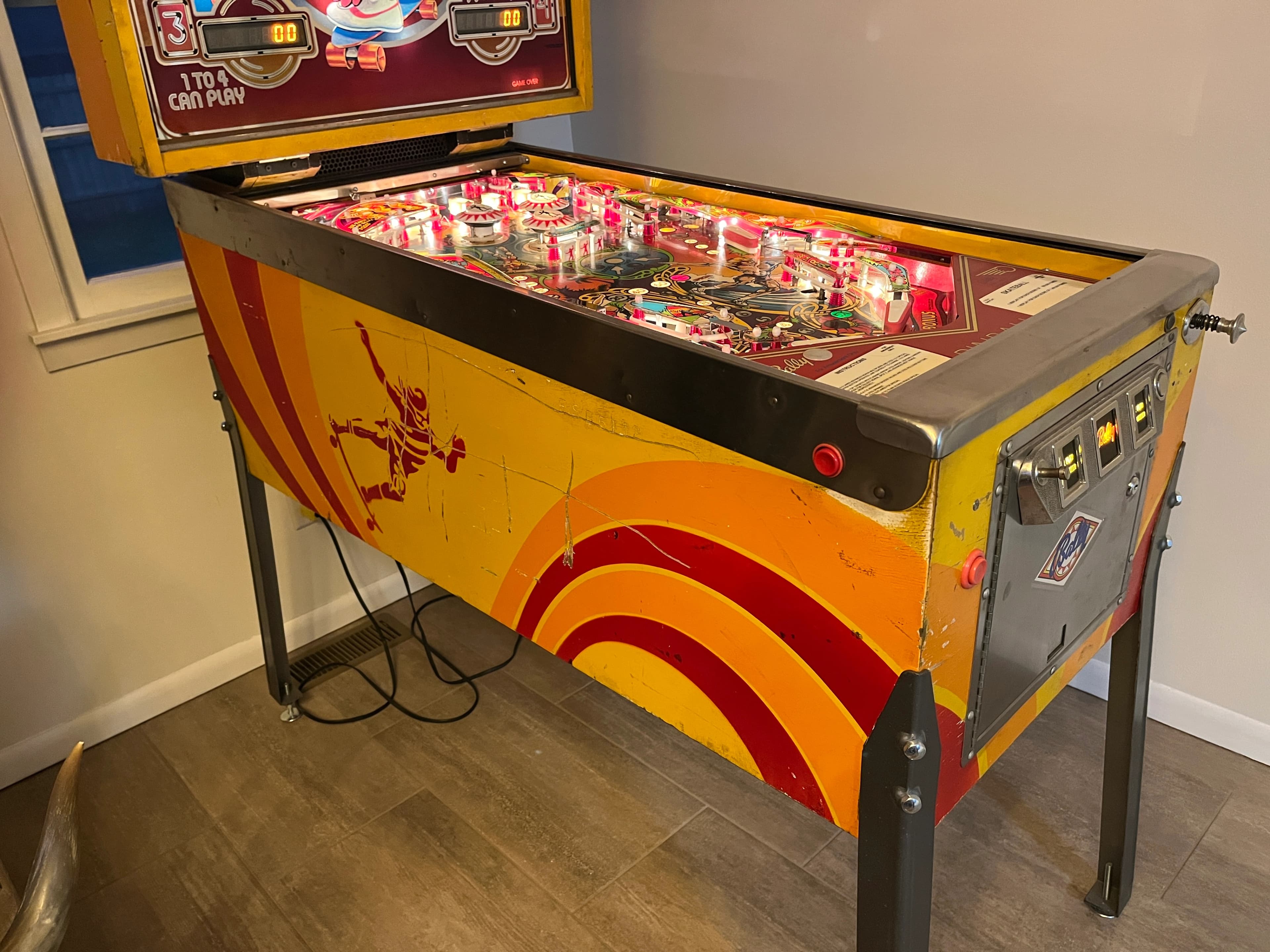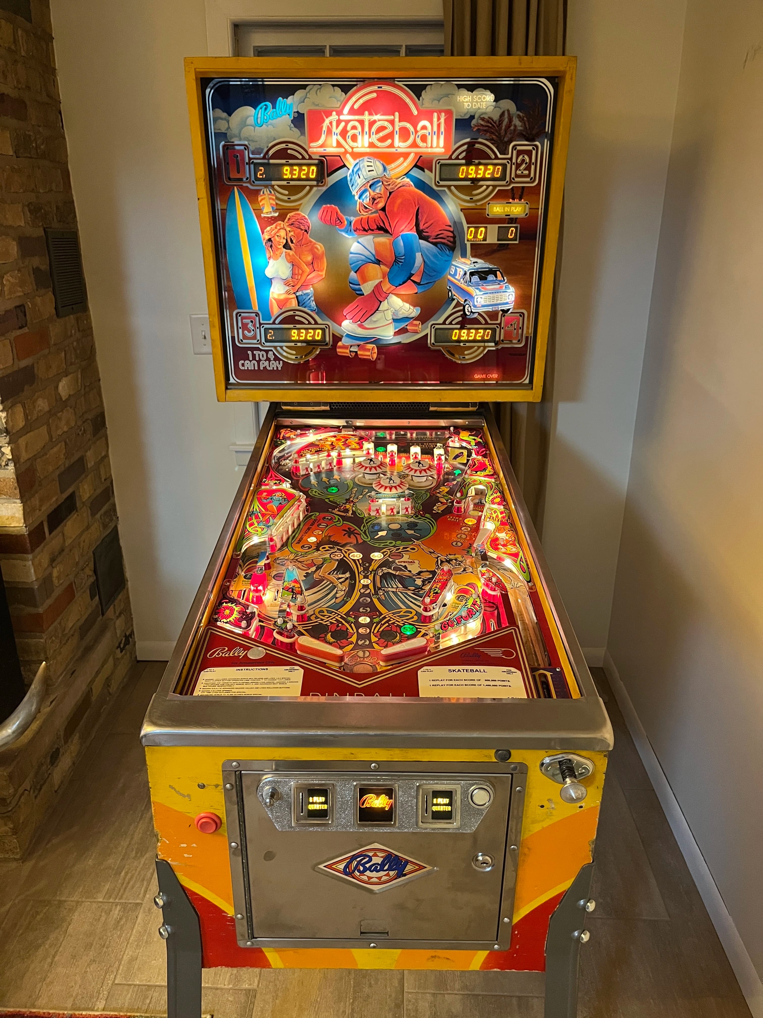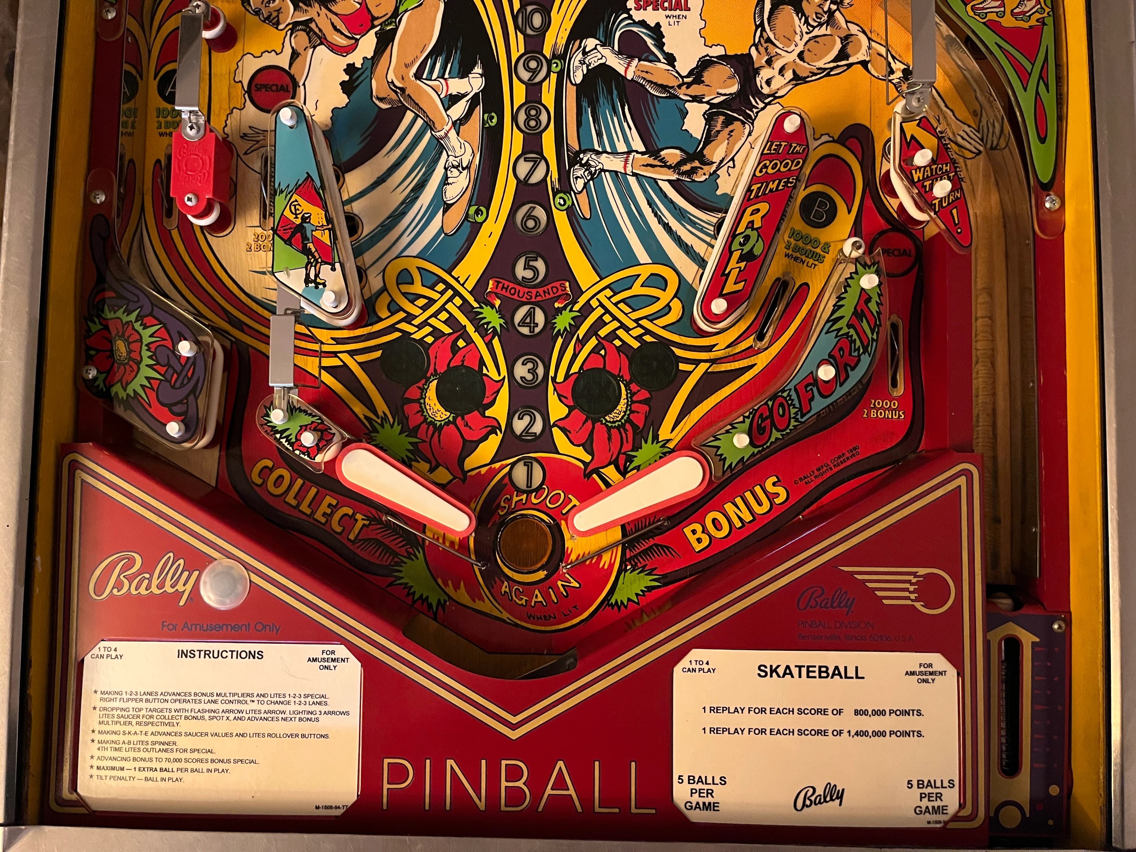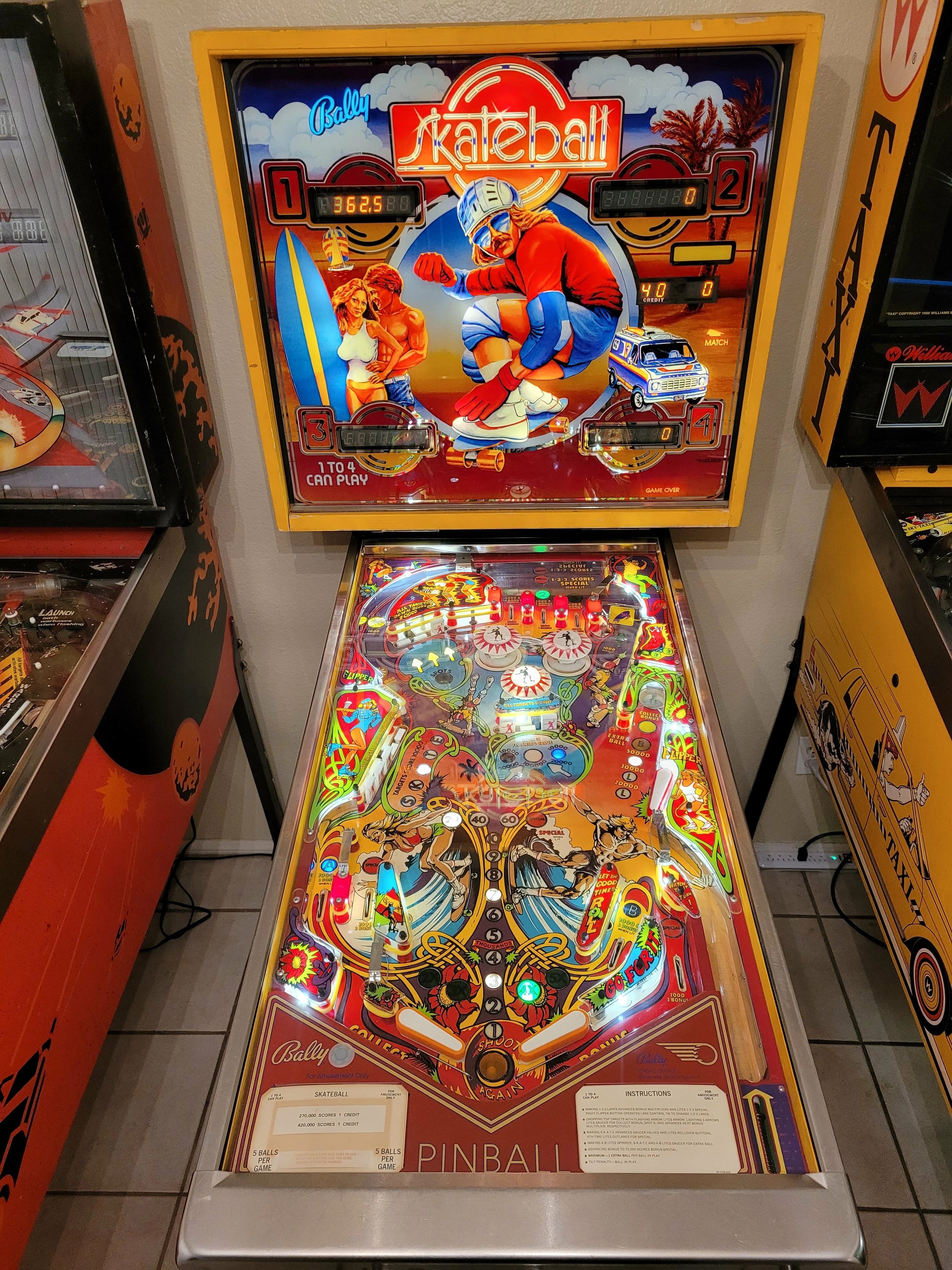 Skateball is one of the best solid state games ever made, with a nice mix of useful shots and a unique playfield design. It’s mostly about bonus and the saucer on the right side. The S-K-A-T-E drop targets on the left are your top priority from the lower right flipper. Each set advances the value of the saucer on the right, from 20K to 50K, then 100K. They also give you bonus advances. But only complete them twice! A third set finishes “B-A-L-L” at the right saucer for an Extra Ball when shot, but EB’s are usually turned off, and the saucer value resets when shot at that stage. You’ll then have to start your saucer value over from scratch. Bonus multiplier is advanced two ways: completing the top three lanes [which have flipper-button lane change in the reverse of the usual direction] or completing the three arrow drop targets at the upper left when the green “X” light below them is on. Base bonus is also advanced by the top lanes. Bonus goes up to 60k, and the multiplier goes up to 5X. Your bonus multiplier is held from ball to ball, so getting it up high early is important. Base bonus is held at 20,000 increments, e.g. if you have at least 20k bonus but less than 40k, 20k is held to the next ball. Bonus can be collected during the ball at the saucer and, most importantly, is not reset when collected. You can enable the collect by getting the three upper left drop targets when flashing. [A successful shot will be indicated by the light under that target being lit steady.] The need to complete the upper flashing drops to enable the bonus collect means that it’s often wise not to shooting at those targets with the lower flippers until your bonus is significant; just use the upper left flipper, since there’s not much else to do with it. Likewise, don’t shoot the saucer when collect is lit if you haven’t built up much bonus or your multiplier yet - - save it for when it’s worth more. Key feed: the kickout from the right saucer. You have several choices of what to do with it: let it roll uninterrupted, hold the upper flipper up, have that flipper up but drop it as the ball gets to it, or flip away at the Skate targets. You’ll need to experiment to find which is best, since each game is slightly different. Usually either the hold up or hold-and-drop is best. On many units, letting it roll risks a right side drain or an uncontrolled bounce off the top of the slingshot towards the center. Flipping away risks missing your shot and draining but may be necessary if neither hold option is reliably safe. Tournament Skateballs will have the wire in the right return lane snipped to make the lane one-way-down only. This is to prevent players from cradling the ball on the right flipper and quick-flipping to make the ball roll up and down that lane to score two bonus advances with almost no risk. Shot management: with the ball on the right flipper, it’s almost always best to shoot the Skate targets until the saucer is worth 100K or you have a large bonus value ready to collect there. At that point, try to transfer the ball to the left flipper to shoot the saucer unless you can backhand it from the right flipper safely. With the ball on the left flipper, you have several choices: if the saucer is worth either 100K or a large collect bonus value, shoot the saucer. If not, you can still shoot the saucer, or go up top through the spinner for spin points and to get a lane towards advancing your bonus multiplier. Sometimes, you can use a saucer shot as dual-purpose for both points and a flipper transfer if the kickout can be directed so that the ball ends up on the right flipper. Regardless, learn to make the saucer shot with the left flipper or both. If you haven’t played Skateball before, or not often, remember that the left side return lane and outlane are reversed. Also note the unusual layout of the right side outlane and return lanes. Lastly, avoid the center drop target 3-bank.