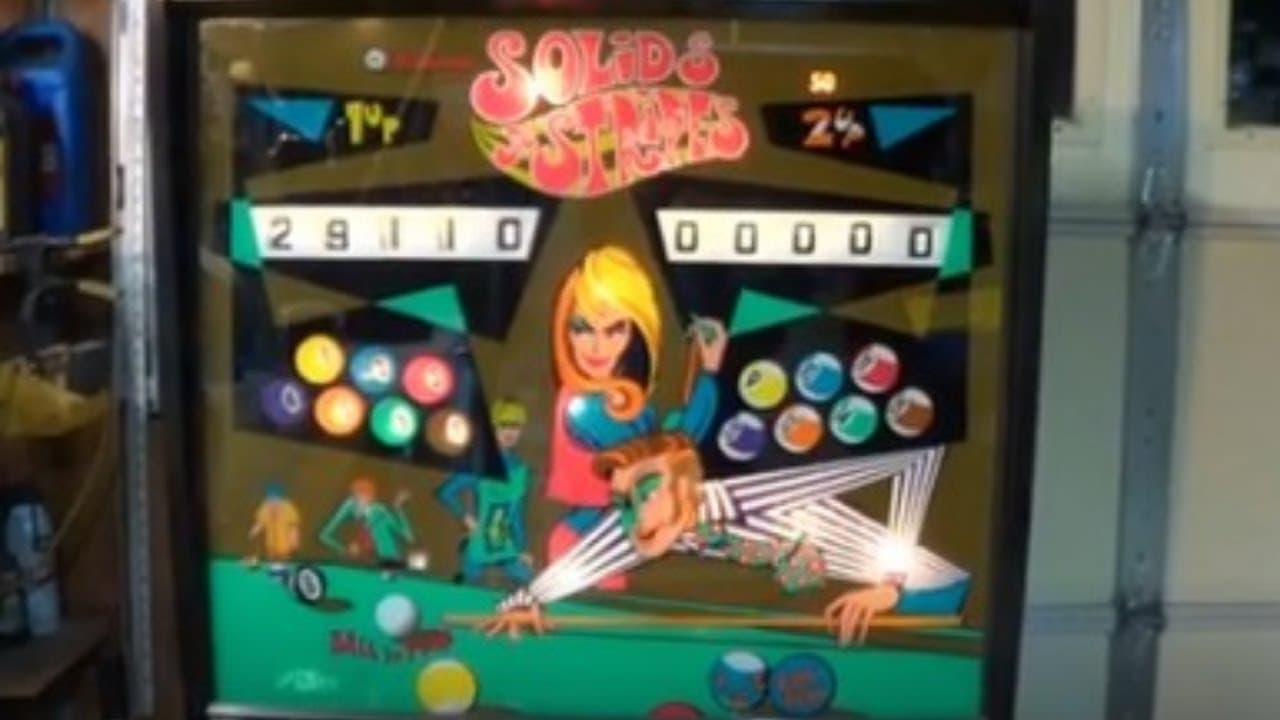 Solids N Stripes, released by Williams Electronic Games in February 1971, is an electro-mechanical pinball machine with a billiards theme. Designed by Norm Clark with artwork by Christian Marche, the game features two flippers, five pop bumpers, six kick-out holes, and two standup targets.