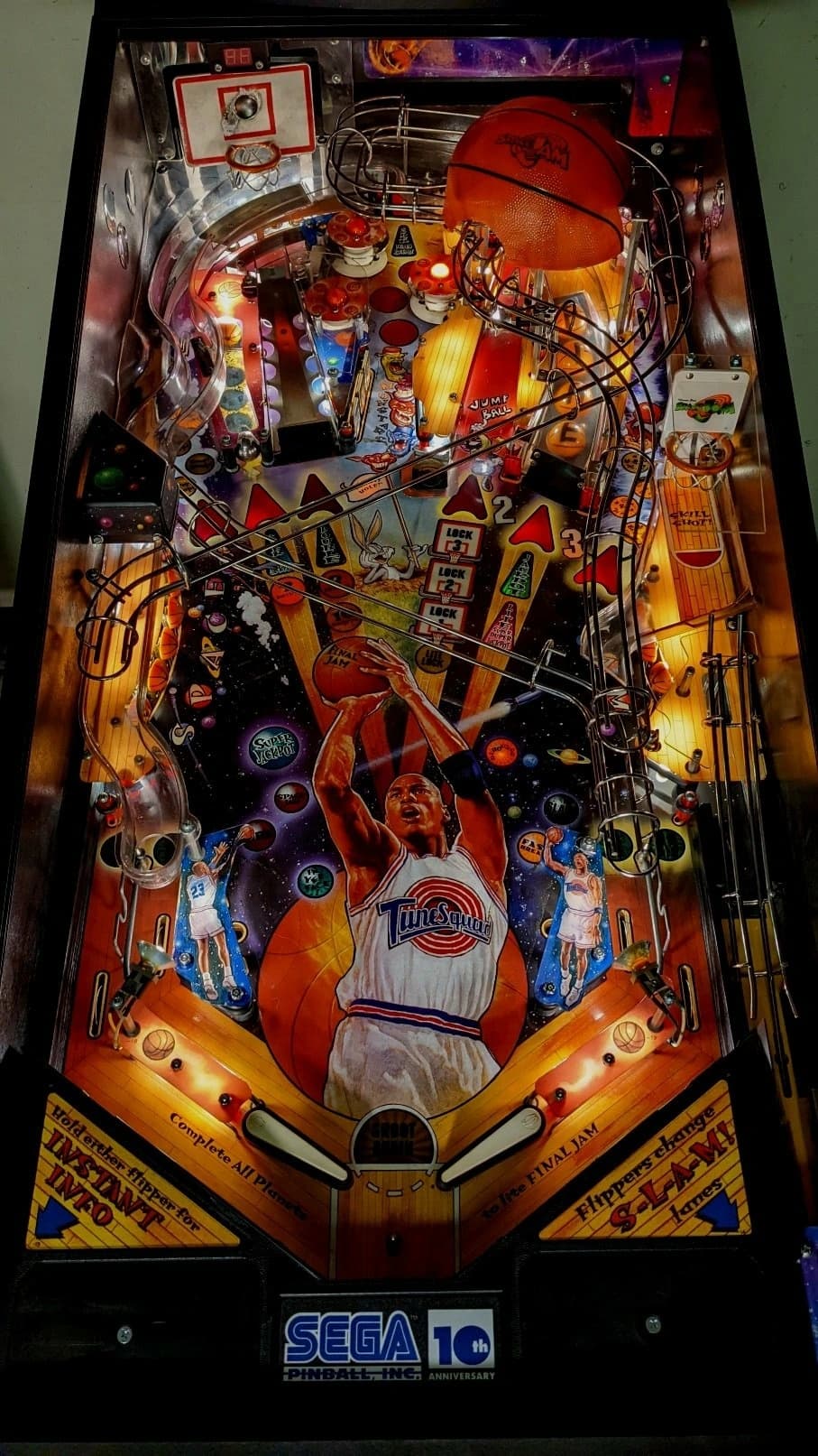 The Space Jam pinball machine, released by Sega Pinball in 1996, is themed around the popular film featuring Michael Jordan and the Looney Tunes characters. Designed by Joe Kaminkow, Lonnie D. Ropp, and Orin Day, the game includes artwork by Morgan Weistling and music by Brian Schmidt.