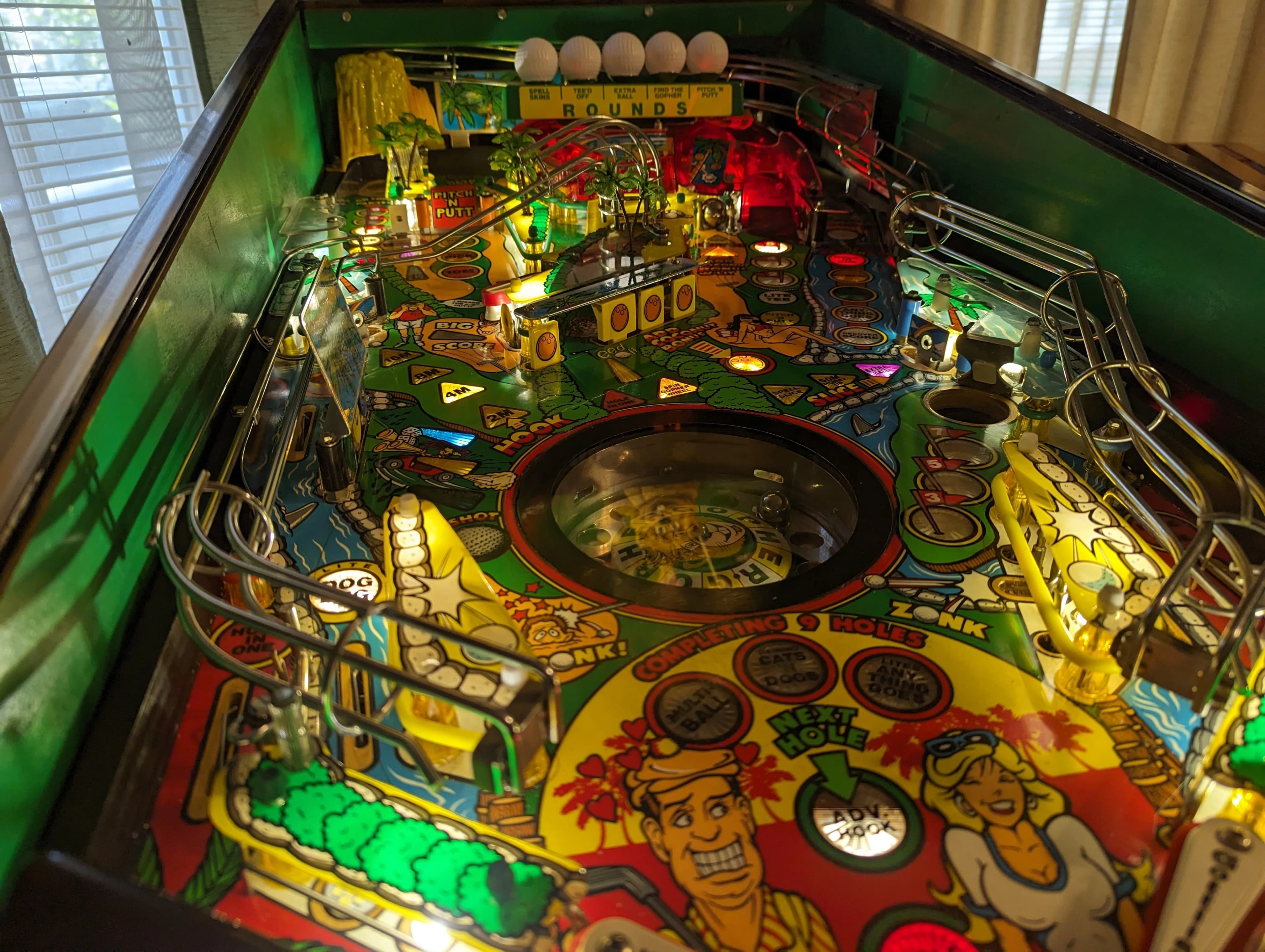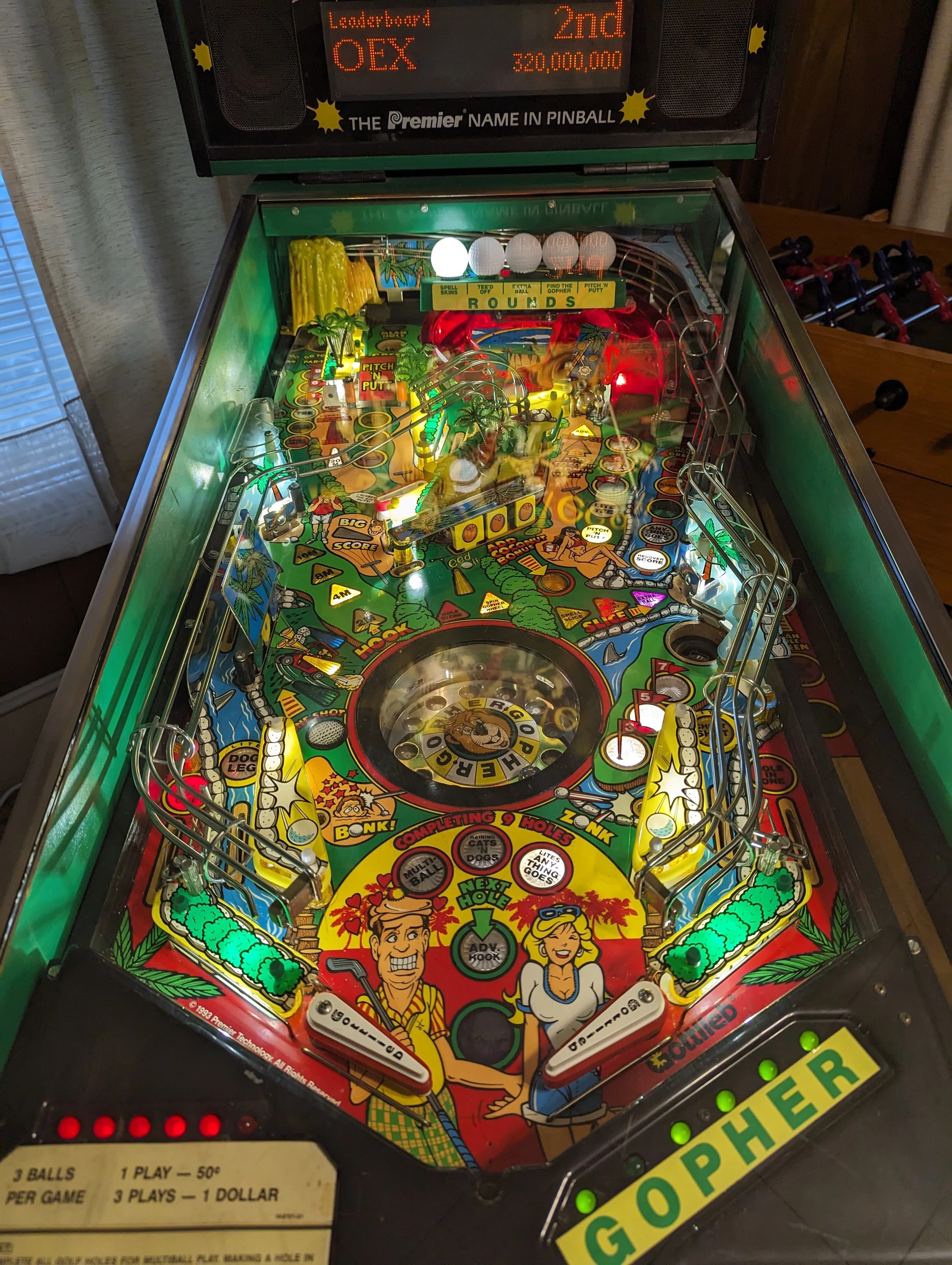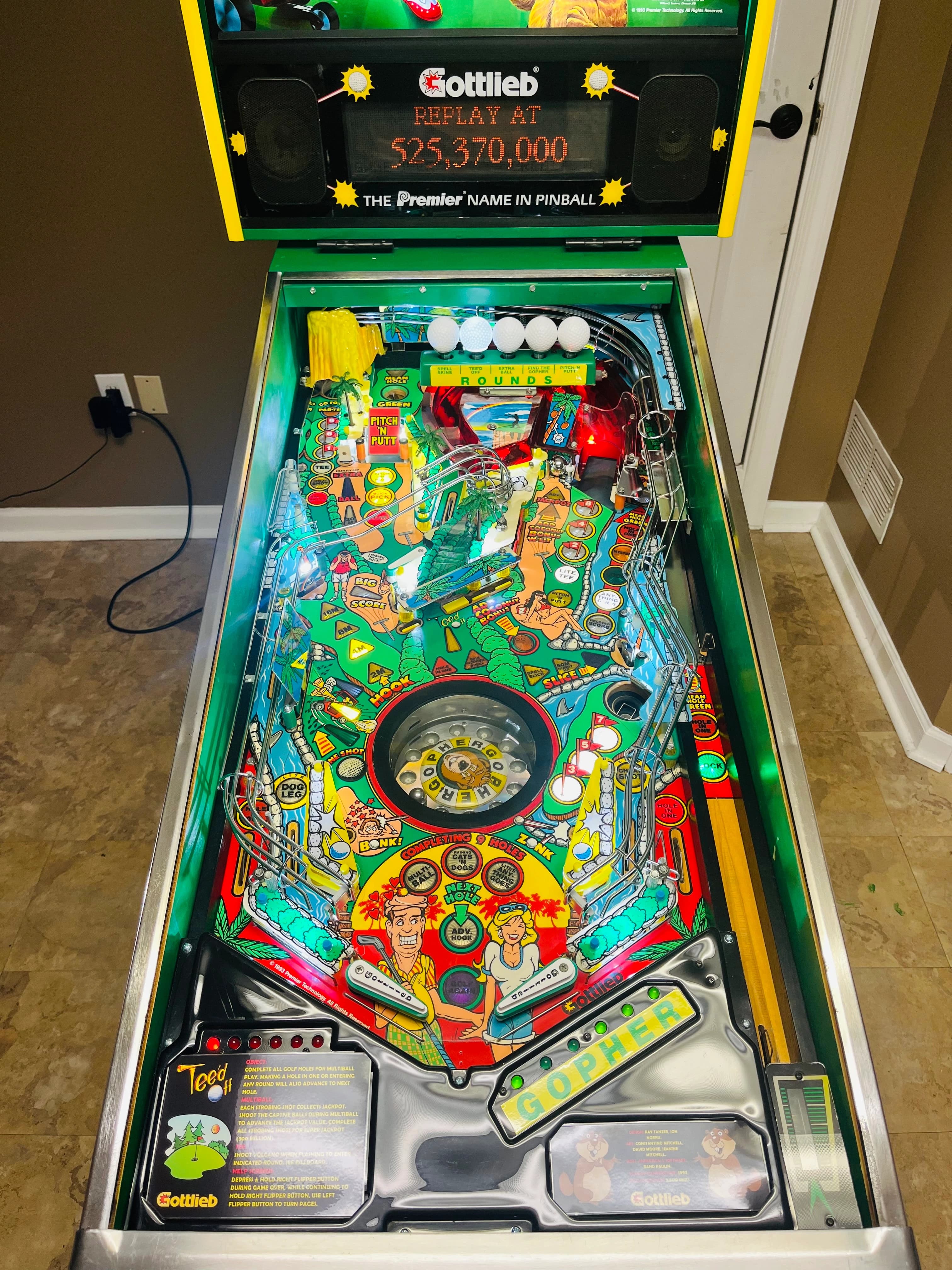 "Teed Off," released by Gottlieb in May 1993, is a golf-themed pinball machine designed by Jon Norris and Ray Tanzer. It features a whimsical take on the sport with a playful gopher character reminiscent of "Caddyshack".