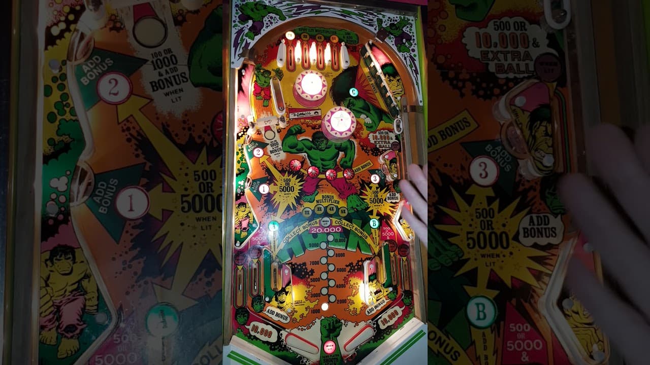 This is a squirrelly type of UTAD game, with bonus being your best means of scoring well. You want to throw the ball up top until you can manage to get it into the 5X lane [the right-hand one at the top] when that lane is lit, but both getting the ball up there and nudging it into that or any other lit lane isn’t that simple. Shots from the right flipper through the spinner may be rejected at times by the rubber pad above it, or typically go up at such a speed that they tend to fall down outside the four lanes. Shots from the left flipper need to be bank shots off the upper right green targets, not all of which will go all the way up, either. Even if you get the ball over the lanes, it’s tricky to nudge it into the lit one. Which lane at the top is lot to activate a bonus multiplier changes with 10 point switch hits, e.g. slingshot. Unlike most games, this machine will award you whichever level of multiplier is lit when you go through that lane when lit. You don’t have to get the 2X before getting 5X, if the 5X is lit when you plunge and you hit it, that’s 5X right away. What getting 2X, 3X etc. do is limit which of the remaining lanes can be lit, i.e. once you have 2X, the cycle only alternates between 3X, 4x and 5X Once you have your bonus at 5X, you want to get your base bonus up to 20K. In practice, there’s a decent chance you’ll get to 20K first, if your ball survives that long. In any event, just keep going UTAD until it’s there, then nudge to collect. Unlike most games with a collect bonus feature, this one is not directly shootable from either flipper. You can only get it by luck or nudging via having the ball fall into either of the chutes just above the flippers. I find your best bet is to shoot the spinner; a shot that doesn’t make it all the way up top will often dribble back through the spinner and fall into the A chute for your collect. Hitting the 1, 2 and 3 standup targets lights both the spinner on the left for 1000 and the lane at the middle right for an extra ball [if enabled]. It’s possible to shoot the ball up it from the bottom of the EB lane, but most of the time you see it collected, it’s via nudging it to enter from above. The top right drop targets add bonus, but I shoot them mainly to try to get the ball to the top lanes. Once at 5X, they’re useful for adding bonus, nothing else. Ball control on Hulk is unique, due to the tiny rubbers on the center sides of the chutes; these are not high-power slingshots, just rubbers, so rebounds off of them are more deflections than kicks. The outlane angles are rude, too, since the inlane-outlane divider is about an inch lower than the entry point. This means most balls that enter cleanly are doomed to the outlane; it’s gotta bounce around a bit to go into the return lane. Key feeds: out of the middle right lane [should go to left flipper], and out of the spinner [into the A, but when it doesn’t go in cleanly, nudge to avoid a rattling-out center drain].