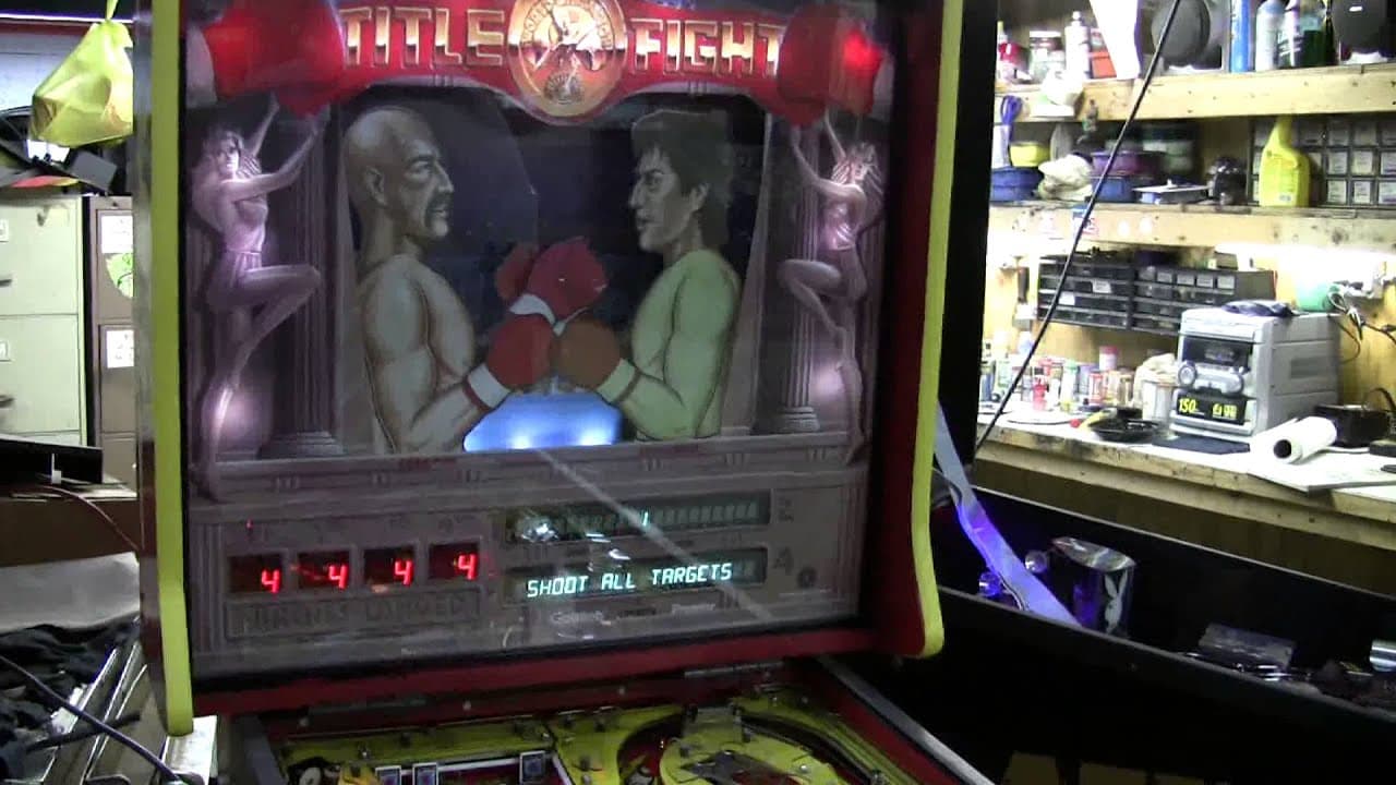 "Title Fight" is a pinball machine released by D. Gottlieb & Co. in October 1990, featuring a boxing theme. The game has five flippers, no ramps, and a two-ball multiball mode. It is part of the Gottlieb System 3 series, with artwork by Constantino Mitchell, David Moore, and Jeanine Mitchell. Only 1,000 units were produced, making it relatively rare.