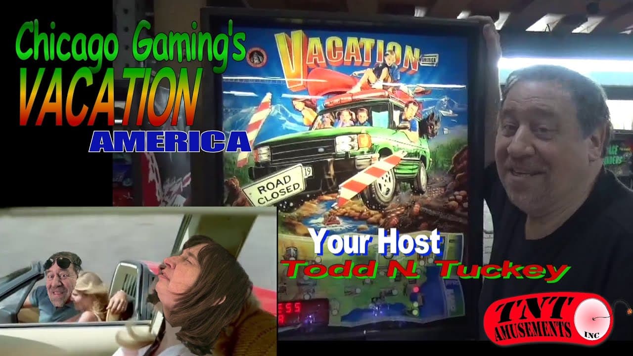 Vacation America, released by Chicago Gaming Company in December 2003, is a solid-state pinball machine designed specifically for home use. The game was designed by John Trudeau and Steve Kordek, with artwork by Paul Faris.
