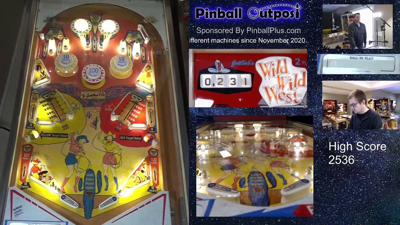 Wild Wild West and Lariat, both released by D. Gottlieb & Co. in 1969, share the same playfield design but differ in reward systems. Wild Wild West is the replay version, where players can win replays by scoring points, while Lariat is an add-a-ball version that rewards players with extra balls instead of replays. Both machines, designed by Ed Krynski with artwork by Art Stenholm, feature two vari-targets and are set in a Western theme.